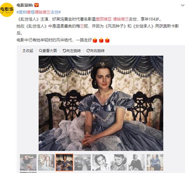 中国观众对德哈维兰最熟悉的角色莫过于1939年上映的电影《乱世佳人》中的梅兰妮一角。《乱世佳人》里的另三位主演:克拉克·盖博、费雯丽和莱斯利·霍华德均已离世超过半个世纪。