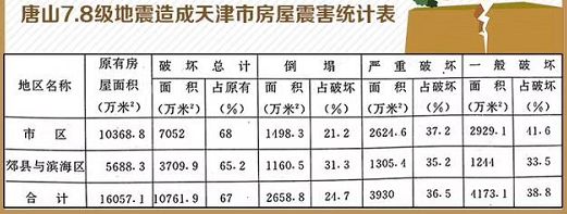 唐山地震波及天津,给天津带来巨大的人员伤亡和经济财产损失。据《天津通志·大事记》和《天津通志·地震志》记载:全市死亡24345人,重伤21497人,有67%的房屋遭到不同程度的破坏(市区68%,郊区、县65.2%)。