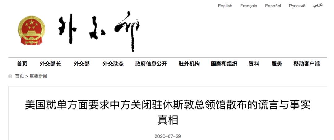 29日,外交部官网发表题为《美国就单方面要求中方关闭驻休斯敦总领馆散布的谎言与事实真相》的文章,从10个方面澄清了事件的来龙去脉,戳破了美方在此事件上制造的谣言。