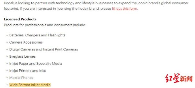 柯达官网显示,品牌授权许可产品包括电池、充电器、手电筒、相机配件、眼镜镜片、喷墨纸、墨水和专用介质、喷墨打印机、即时打印相机以及手机。就连数码相机也是授权其他公司生产。