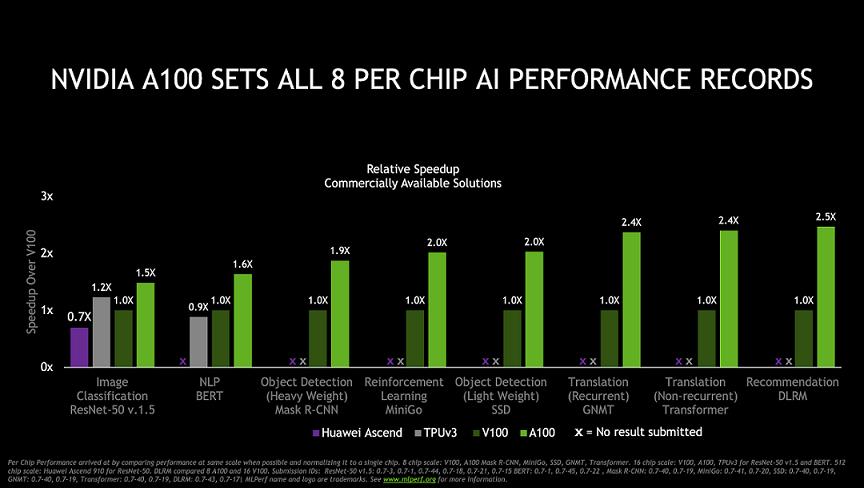 在最新的 MLPerf 基准测试结果中,英伟达新出的 A100 GPU 打破了八项 AI 性能纪录,谷歌的 4096 块 TPU V3 将 VERT 的训练时间缩短到了 23 秒。华为昇腾 910 这次也跑了个分。