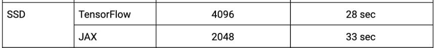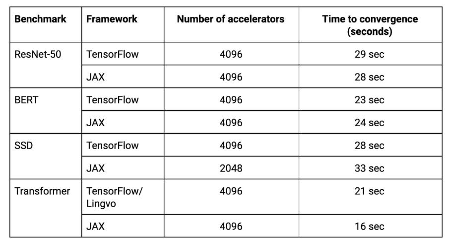 在最新的 MLPerf 测试结果中,谷歌的 TPU 加速器也获得了很好的成绩:在预览和测试组别中,TPU 集群打破了 8 项测试纪录中的 6 项,4096 块并联的 TPU v3 可以实现高达 430 PFLOPs 的峰值算力,训练 ResNet-50、BERT、Transformer、SSD 等模型都可以在 33 秒内完成。