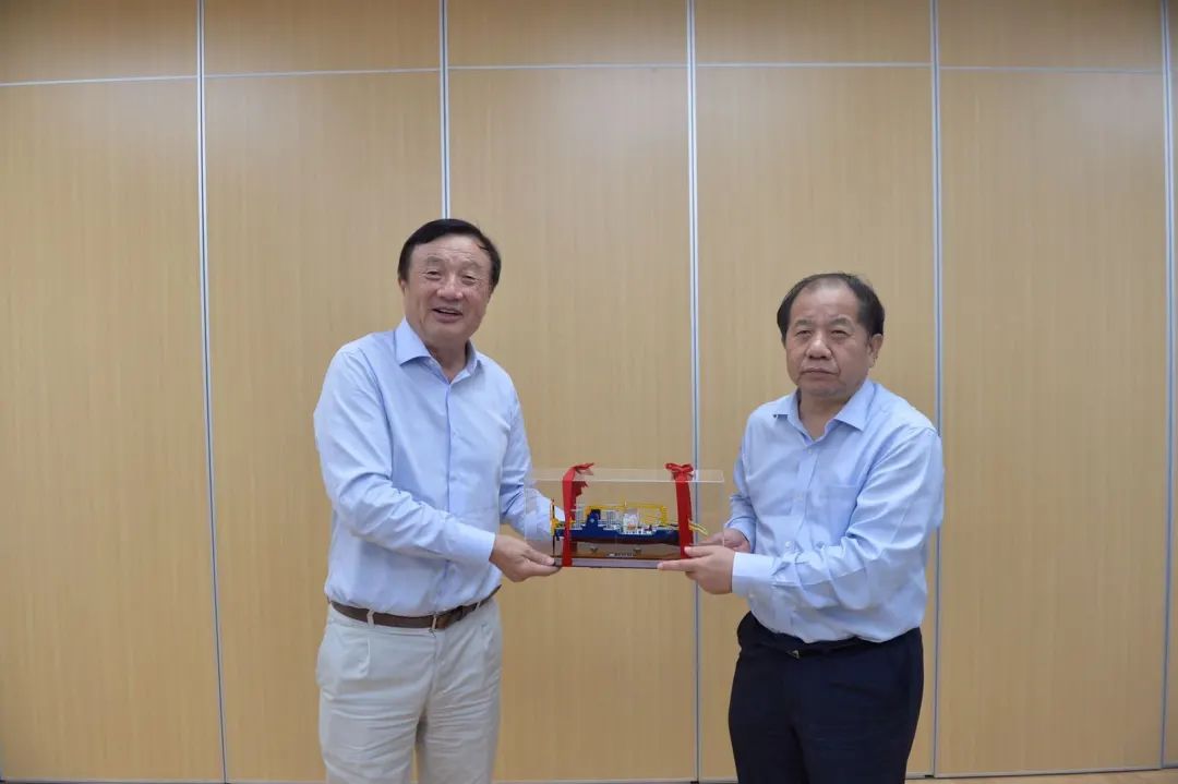 在上海交大转化医学中心一楼会议室,任正非一行与杨振斌、林忠钦、奚立峰、毛军发等交大校领导亲切座谈交流。杨振斌、林忠钦代表学校,向任正非赠送了《上海交通大学史》和“天鲸号”挖泥船模型。