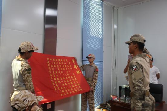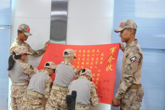最后所有人昂然起立,面对营旗行众目礼,进行了“军令状”郑重宣誓,并在军令状上遒劲有力的签上了姓名。