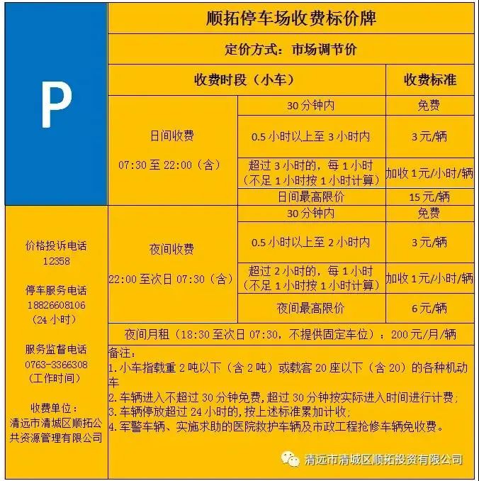 顺拓停车场夜间收费22:00至次日07:30(含):