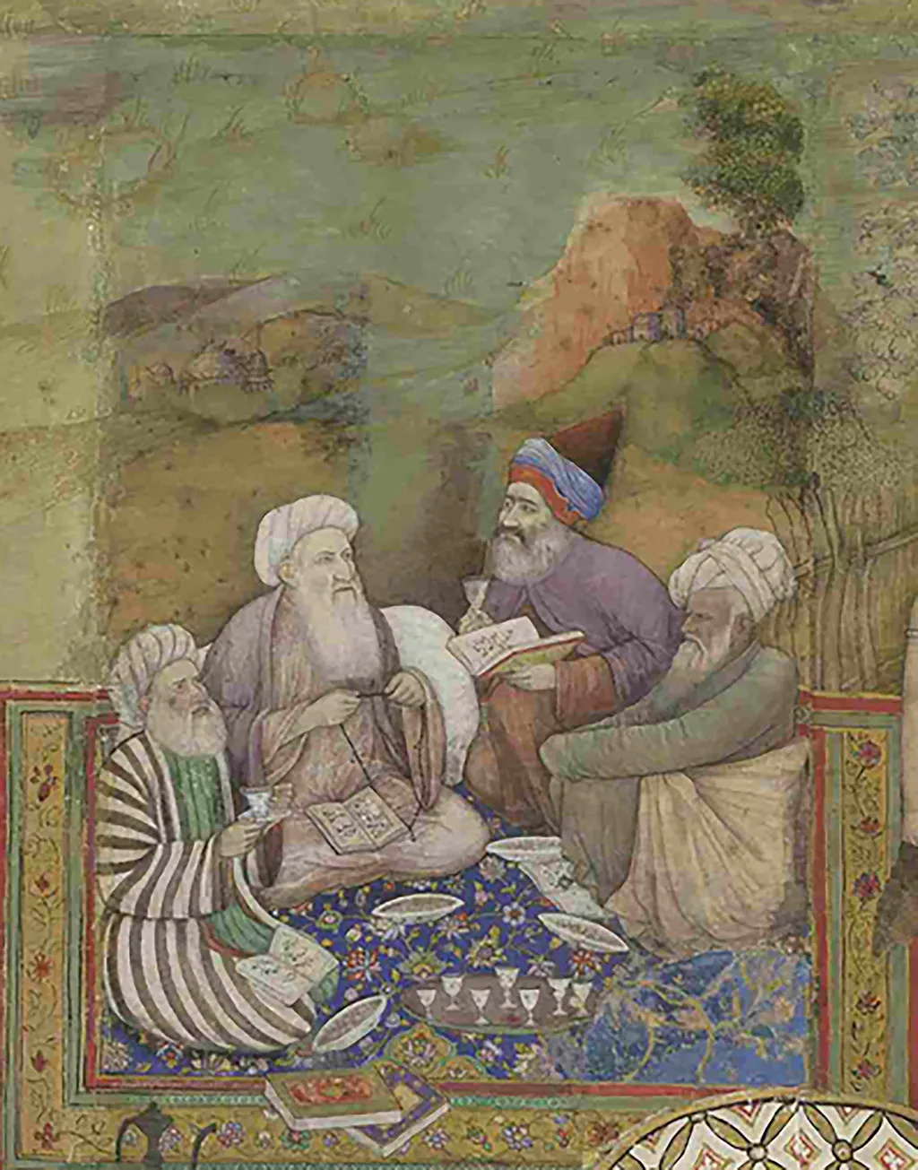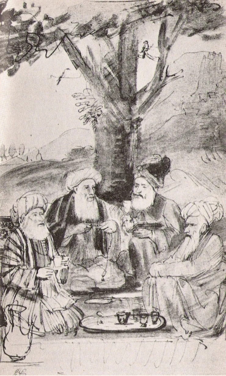 ▲ [荷] 伦勃朗《坐在树下的四位毛拉》(仿印度细密画),1656-1661年,纸本墨水素描,194 x 124 cm