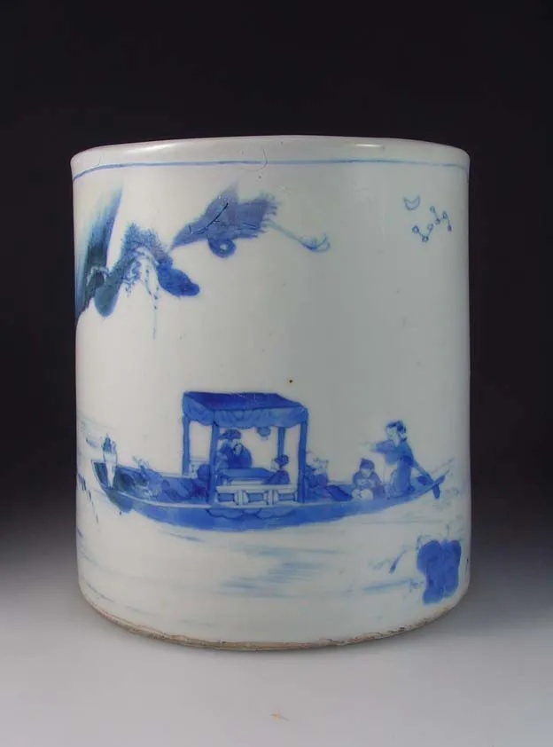 ▲ 清康熙 青花“东坡夜游赤壁”人物故事图笔筒,高13.4厘米,口径12.1厘米,底径12.3厘米