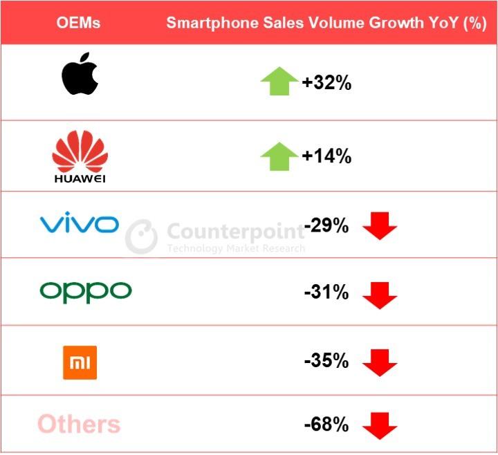 第二件事,据总部位于上海的研究机构CINNO Research的数据,在中国市场,iPhone 于第二季度的销量环比增长了 225%,是第二季度中国增长最快的智能手机厂商。第二季度国内新冠肺炎疫情得到近一步控制,社会秩序的逐渐复苏加大了对智能手机销量的刺激。但智能手机市场整体呈现萎缩趋势,在中国前五的品牌里,除华为和苹果,都出现了大幅度下滑的情况。iPhone 能在如此背景下有增长的表现,难能可贵。