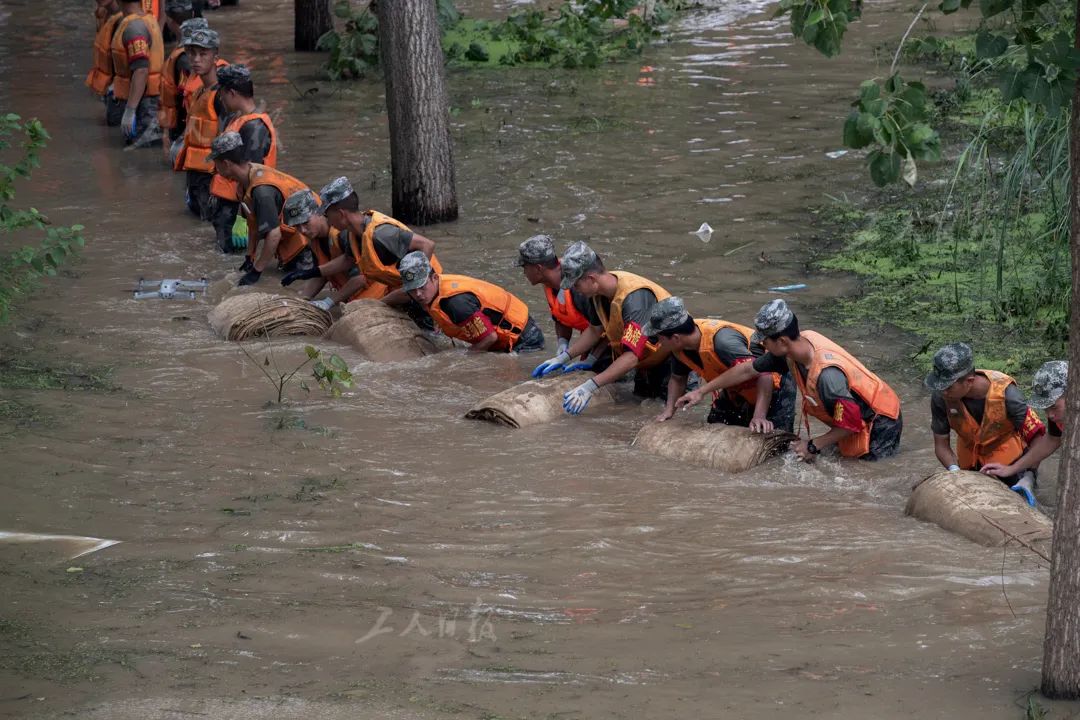 ▲7月30日,安徽省霍邱县冯瓴乡民生村,淠左沟渠堤坝上,71集团军某旅的战士们正在洪水中传运麻袋。