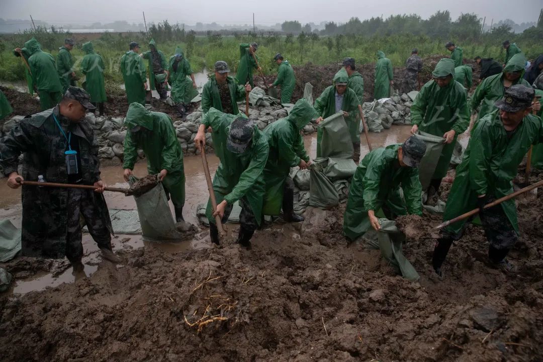 ▲7月18日,安徽省芜湖市无为大堤上,鸠江区民兵应急连的120多名民兵在大雨中装填沙袋,为随时可能发生的险情作准备。
