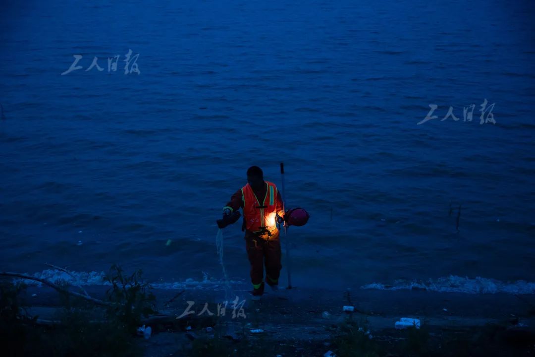 ▲7月16日,江西省余干县石口镇康山大堤上,来自福建消防救援总队宁德支队的吴杜军巡坝结束后,用湖水清理雨靴里的泥沙。