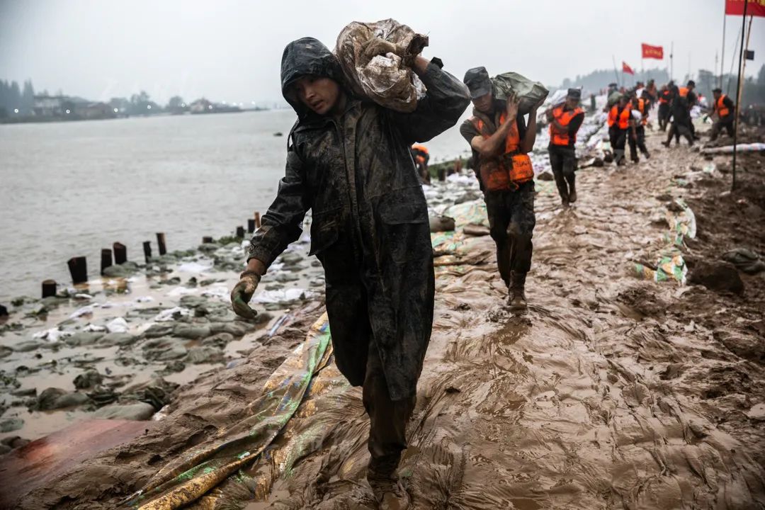 ▲7月26日,安徽省合肥市庐江县白石天河同大圩,暴雨持续肆虐,本就泥泞不堪的堤坝更加难走。一名战士在搬运沙袋时不小心深陷泥坑。