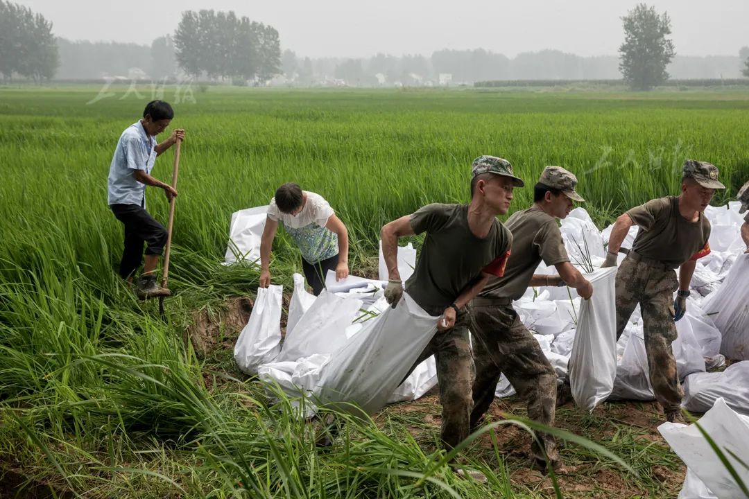 ▲7月30日,安徽省霍邱县冯瓴乡民生村,解放军官兵正和村民一起装填沙袋。