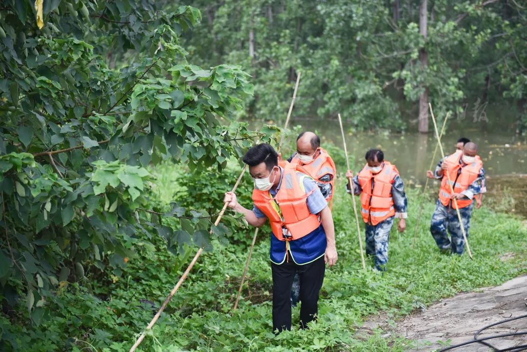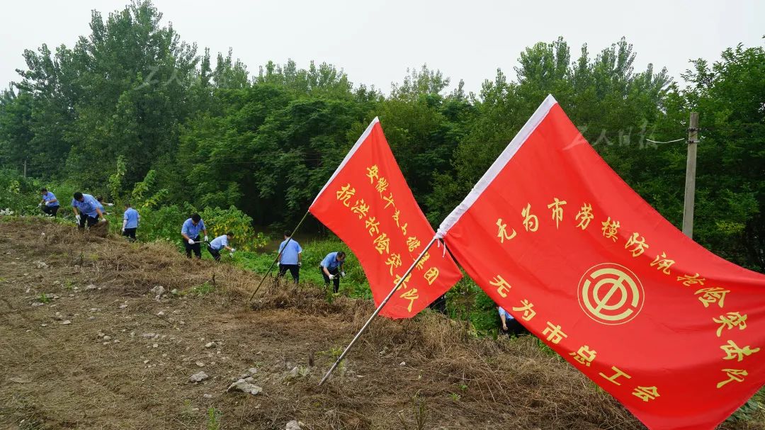 ▲7月14日,长江无为大堤上,一支“劳模突击队”正在江堤上砍除杂草排查险情。