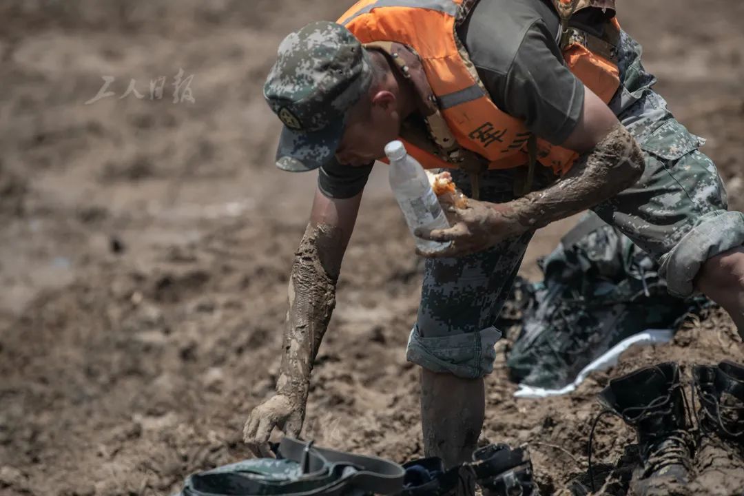 ▲7月25日中午,安徽省合肥市庐江县白石天河同大圩,奋战了十余个小时的官兵们终于有时间稍作休整。一名满身裹满了泥土的战士,正在补充体能。