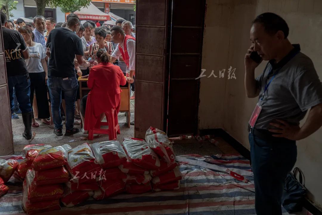 ▲7月29日,安徽省六安市固镇镇,志愿者正在一处仓库前登记居民受灾情况,并为各家各户发放抗洪物资。