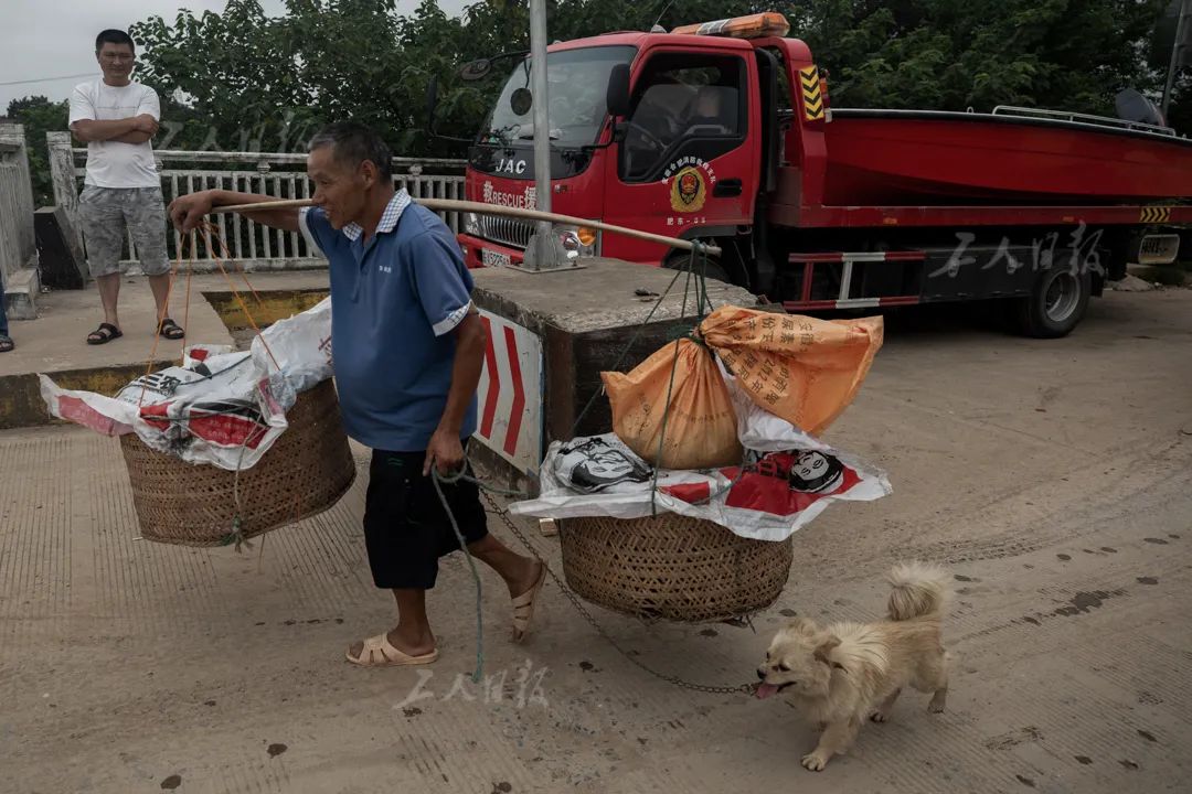 ▲7月23日,安徽省庐江县同大镇,一名村民正挑着家当进行转移。