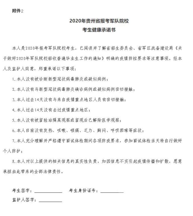 (二)达到提前批次军队院校面试分数线并接到通知的考生参加面试、体检需携带准考证、身份证、政治考核表、2020年贵州省报考军队院校考生健康承诺书和本人近期1寸白底免冠照片(2张)。考生14天以内有疫情中高风险地区活动史,出现过发热、咳嗽等症状,健康码扫码非绿色,或面试体检当日体温超过37.3℃,需持3日内核酸检测报告,于8月5日统一到第九二五医院进行面试、体检;考生参加面试、体检期间,必须全程佩戴口罩,不得私自摘下,做到听招呼、守规矩,违反规定且情节严重的考生取消面试、体检资格;因疫情防控工作需要,除家长代表外,陪同考生的家长不得进入面试、体检等工作场所,不得在检录、面试、体检现场外围扎堆逗留,不得将车辆停放在医院内;考生在检录处出示健康码后,将手机交予陪同家长,不得带入面试、体检现场,若无家长陪同,则集中存放在检录点旁手机柜内。