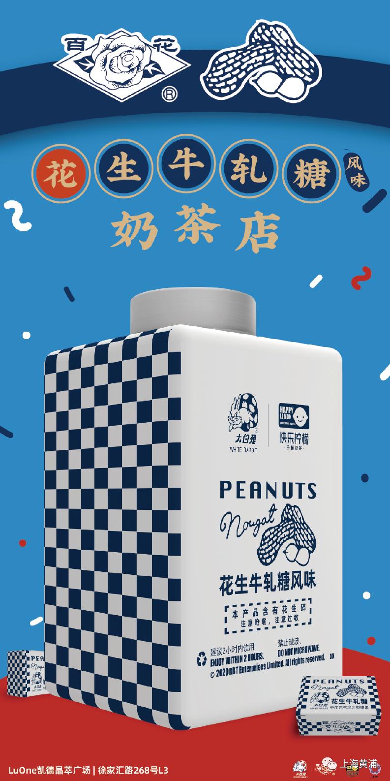 7月31日-9月16日,大白兔品牌旗下又一怀旧经典品牌产品,百花牌花生牛轧糖,也带来了一次极具有创新的尝试,在LuOne凯德晶萃广场L3中庭开了一家花生牛轧糖衍生品快闪店。更值得一提的是,此次百花牌花生牛轧糖也在消费者的呼声中,联合快乐柠檬品牌推出了花生牛轧糖风味奶茶店。