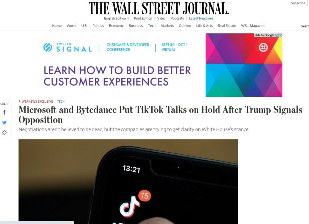 据外媒报道,7月31日TikTok将在美国禁用的消息传出;8月1日,据知情人士透露,微软正在就收购TikTok美国业务与字节跳动进行谈判;到了今天(8月2日),《华尔街日报》报道称,微软暂时放弃了磋商。