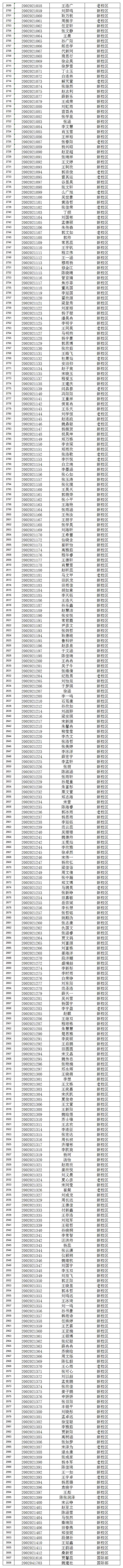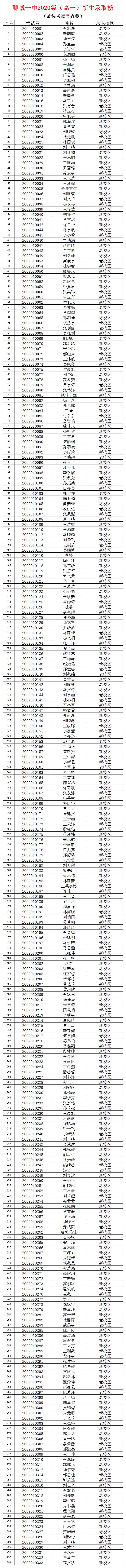 根据山东省教育厅高中招生有关规定,在市教体局的统一组织下,2020年高中招生工作已经完成。下列同学已被录取为聊城三中高一年级新生,向您及家长表示祝贺。由于是疫情期间,学校不再张贴榜示,请家长及学生关注聊城三中微信公众号或登录聊城三中官方网站进行查看,并随时关注新高一最新消息。相信聊城三中将会成为您放飞梦想,谱写华章的地方。