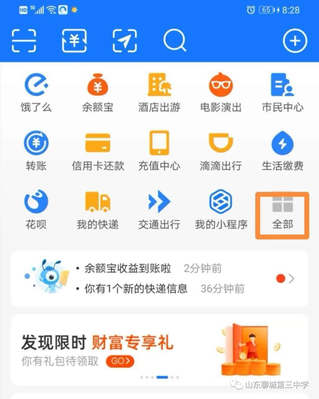 第二步:打开支付宝客户端,如下图所示找到“全部”选择进入。