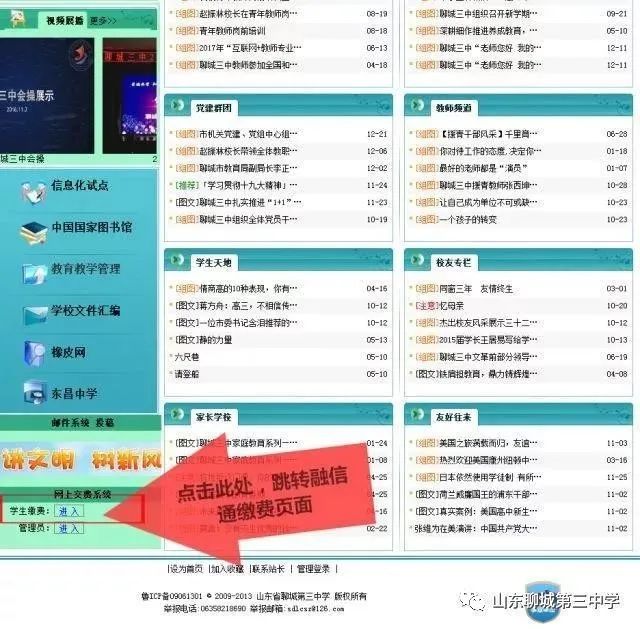 搜索“山东聊城第三中学 ”官网,首页左下角,找到“网上缴费系统”→“学生缴费”→“进入”→输入学生身份证号码、姓名→选择关联银行→缴费→缴费成功。