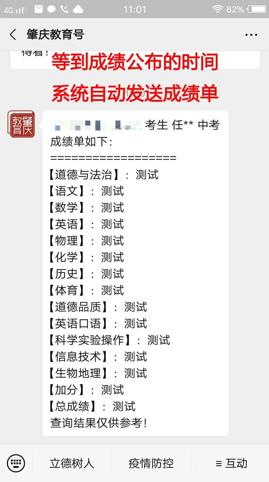 短信息推送:市教育局主动将中考成绩推送到考生报名时填报的手机号码(部分手机设置了短信息拦截功能的,短信息可能会被拦截,请在拦截里查找)。
