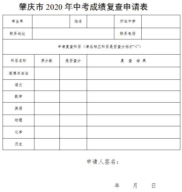 1.考生在获得中考成绩后,如对本人中考某科成绩有疑问,请于8月5日12:00前携带本人准考证和成绩通知单向当地县(市、区)招生考试部门提出成绩复查的书面申请,填写《肇庆市2020年中考成绩复查申请表》。在学校报考的考生可由学校统一组织办理。成绩复查不收费,超过成绩复查申请期限的一概不予办理。