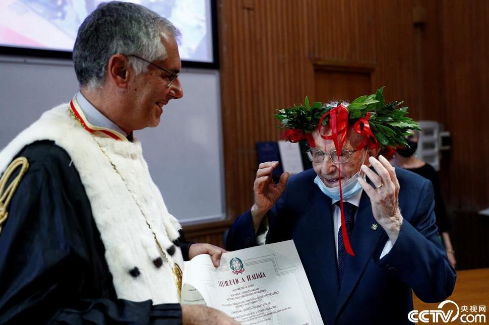 近日,意大利巴勒莫大学为一位96岁的铁路工人举行了隆重的大学毕业典礼,老人以优异的成绩获得了该校历史与哲学系学士学位,令人敬佩。(央视网)