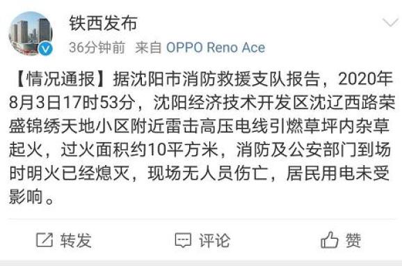 据沈阳市消防救援支队报告,2020年8月3日17时53分,沈阳经济技术开发区沈辽西路荣盛锦绣天地小区附近雷击高压电线引燃草坪内杂草起火,过火面积约10平方米,消防及公安部门到场时明火已经熄灭,现场无人员伤亡,居民用电未受影响。