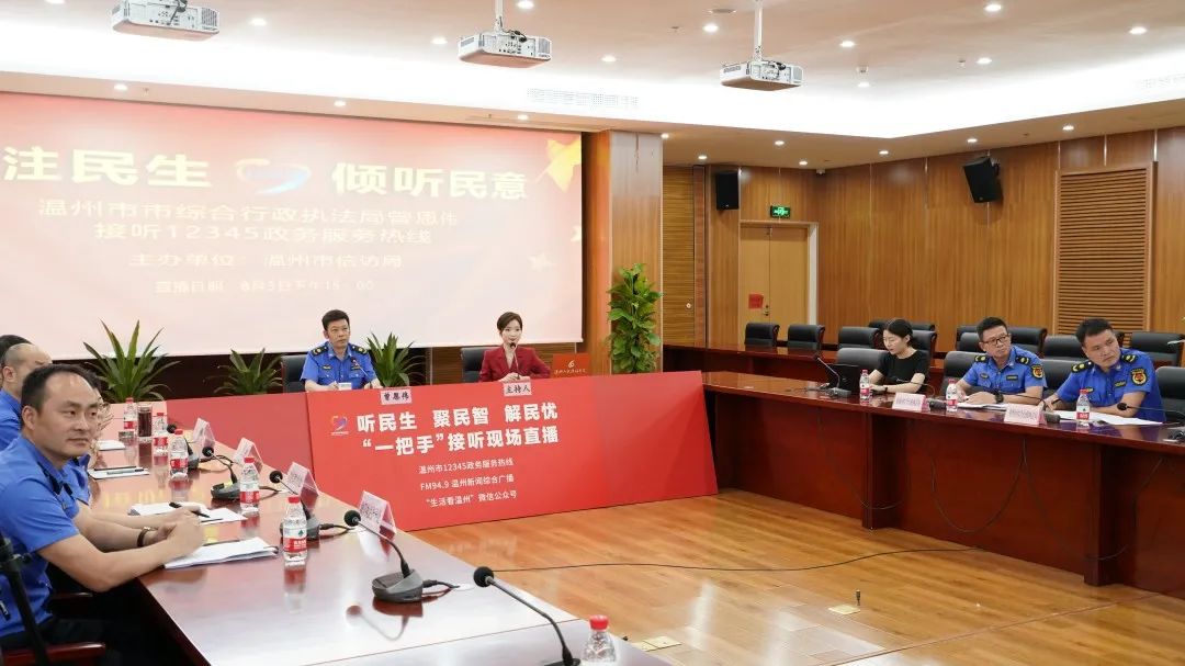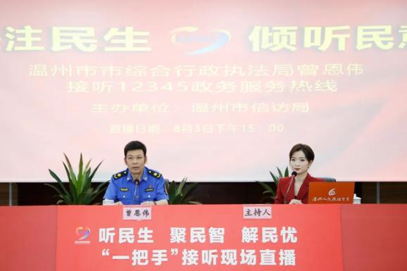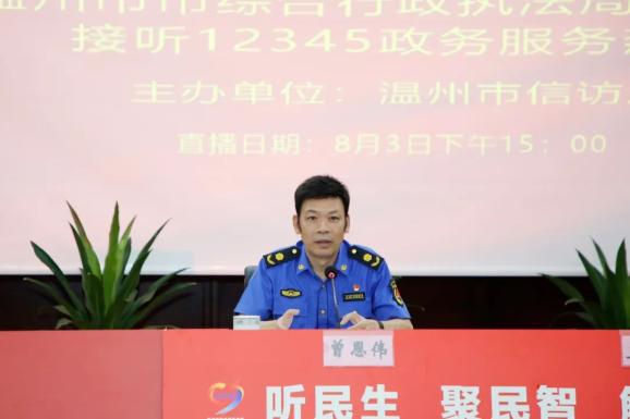 今天(8月3日)下午,温州市综合行政执法局局长曾恩伟做客由温州人民广播电台和“12345”政务服务热线联合举办的大型融媒体视频互动直播节目,现场接听热线,回应百姓诉求。