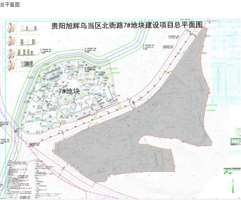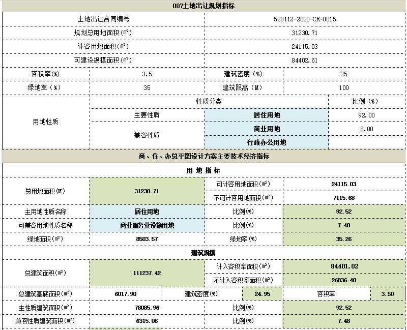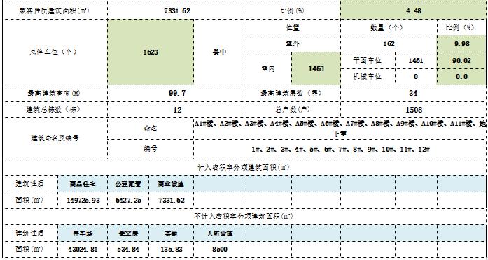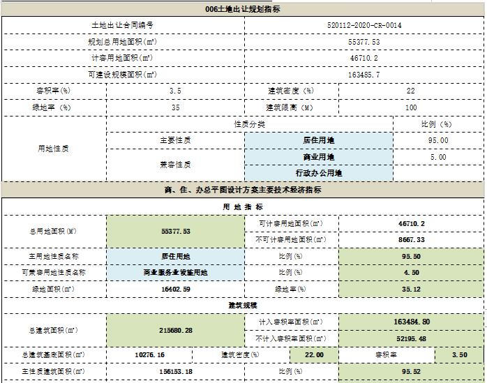 本次审查内容为贵阳旭辉乌当区北衙路6号地块总图方案,方案主要经济指标:总建筑面积215680.28平方米,其中计容面积163484.80平方米(住宅149725.93平方米,商业7331.62平方米,公建配套2423.95平方米,幼儿园4003.3平方米),容积率3.5,不计容面积52195.48平方米(停车场43024.81平方米,架空层面积534.84平方米,其他135.83平方米,人防设施8500平方米,),停车位1623个(室内平面车位1461),建筑占地面积10276.16平方米,建筑密度22%,绿地面积16402.59平方米,绿化率35.12%,规划户数1508户。