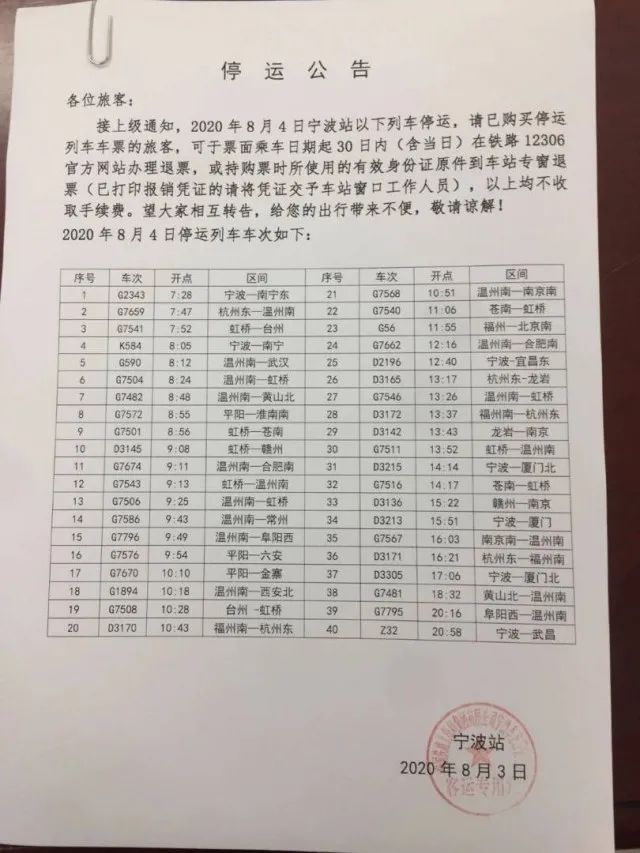 8月4日铁路宁波站40趟列车停运