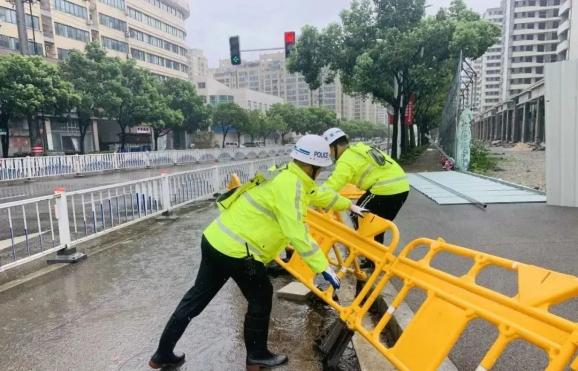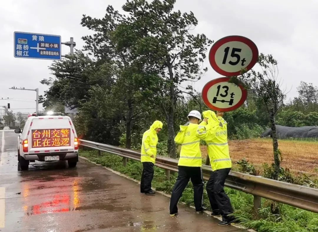 台风过境,集聚区部分路面经过风雨洗礼受到损坏。8月4日6点30分,台州公安交警四大队二中队组织全中队警力上路巡逻,对辖区内被台风吹倒的树木、广告牌、护栏等设置进行扶正搬离,确保辖区早高峰安全。
