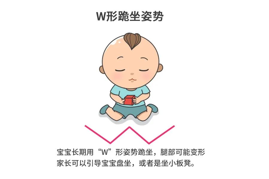 刚学坐或学爬时,宝宝容易跪坐成一个“W”形,家长要帮忙改正。