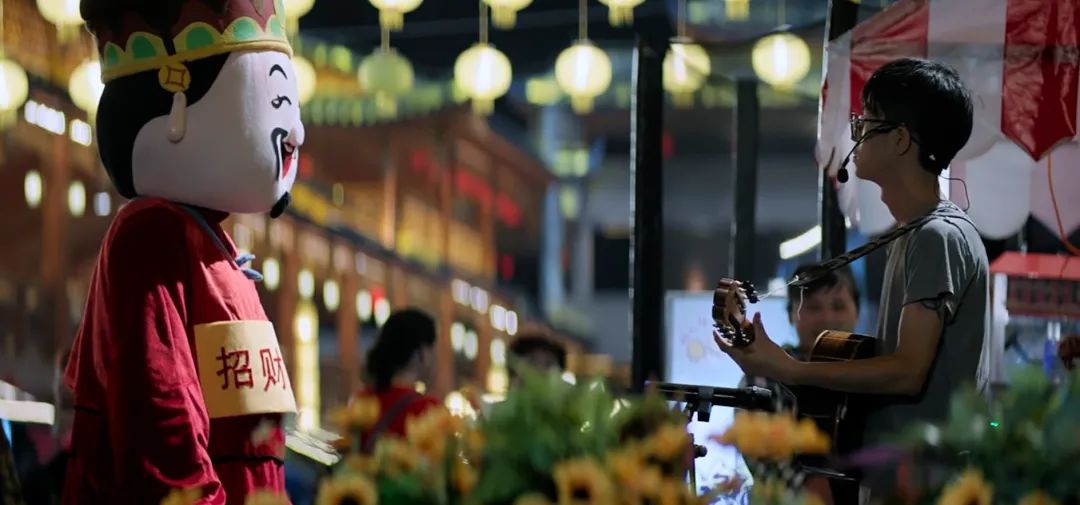 两年后,饶晓志的荒诞喜剧《无名之辈》上映。西山大桥绚丽的夜里,尧十三站在街边弹唱《瞎子》,电影主角在他身边交织游走,人生苦短。