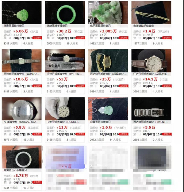 8月6日上午10点,南京市中级人民法院通过阿里拍卖在线平台,公开拍卖7块名表、5件玉器及1件手链。