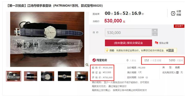 在阿里拍卖网站上,这块江诗丹顿手表(PATRIMONY系列,款式型号86020)的评估价高达75万元,起拍价53万。截止今日下午四点,已有五千多人围观。