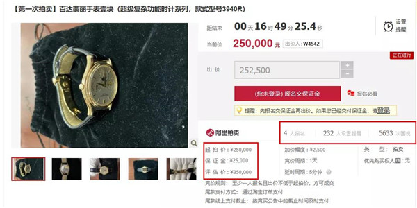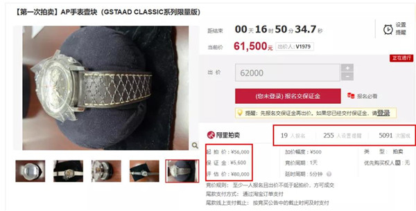 据阿里拍卖页面数据,价格较低的手表最受欢迎,这些拍卖品的围观人数均已上千,其中人气最高的是一块全新未拆封的AP手表,目前已有19个人缴纳保证金参与报名。