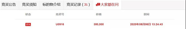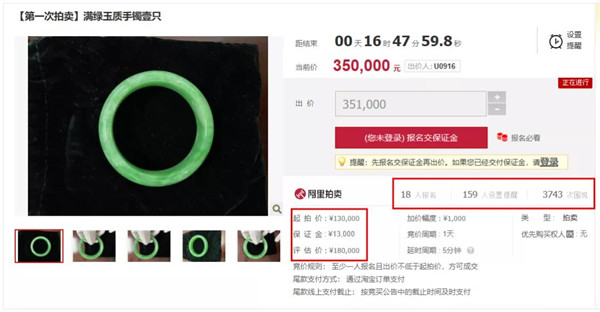在这些拍卖品中,最受欢迎的是这只满绿玉质手镯,这只手镯起拍价是13万元,而到现在已经将近翻了两倍,截止今日下午两点,已经有18个人报名缴纳保证金,共有31条竞买记录,最新的竞买价格为35万元。拍卖将于明日(8月6日)上午10点整结束,没有拍到还有机会。
