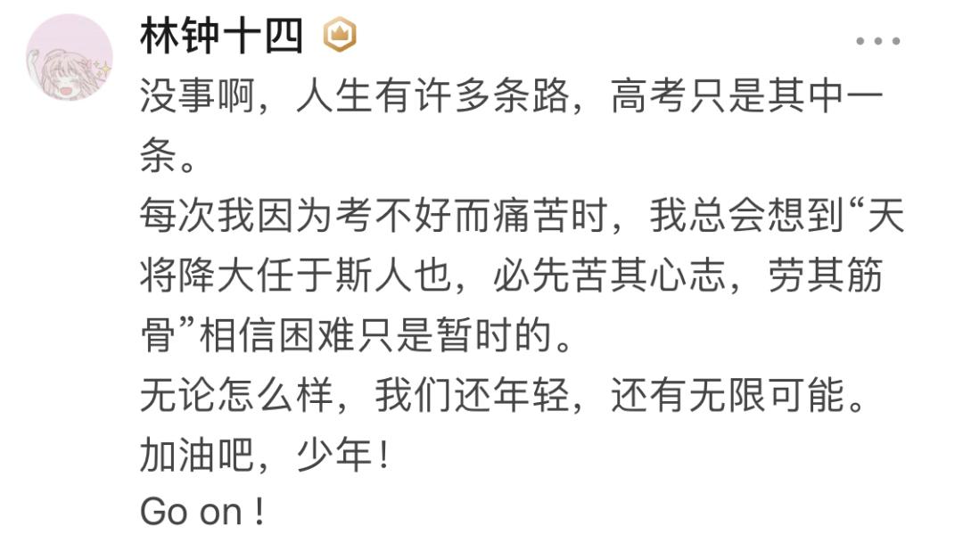 高考虽然是人生的一个转折点,但它并不是终点,大可不必为了一次失败就放弃自己。