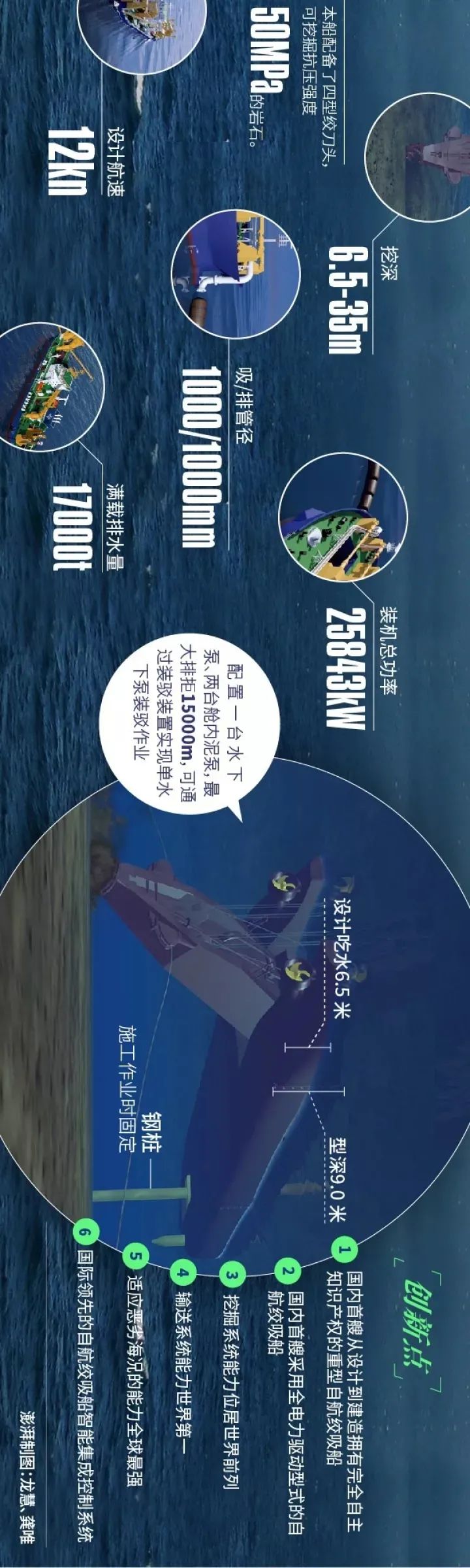作为我国首艘从设计到建造拥有完全自主知识产权的重型自航绞吸式挖泥船,“天鲲号”远程输送能力世界第一,其泥泵电机总功率17000千瓦,最大设计排距15公里。