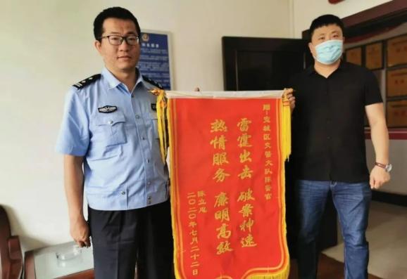 7月29日上午,陈先生把一面写着“雷霆出击、破案神速、热情服务、廉明高效”的锦旗送到了宽城大队,并道明事情原由。