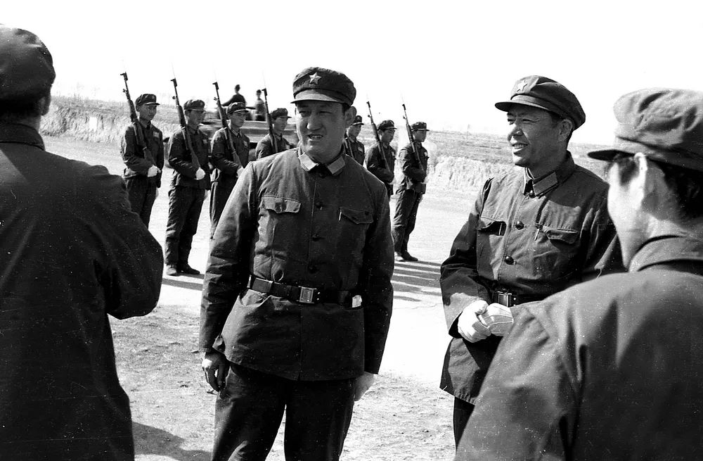 阅兵方队总指挥188师师长刘逢军(右,后任北京军区副司令北京卫戍区司令)与564团团长孙克文(左)在现场组织训练。