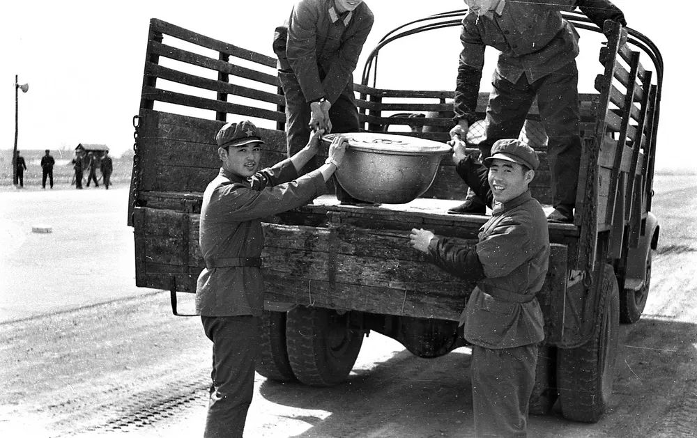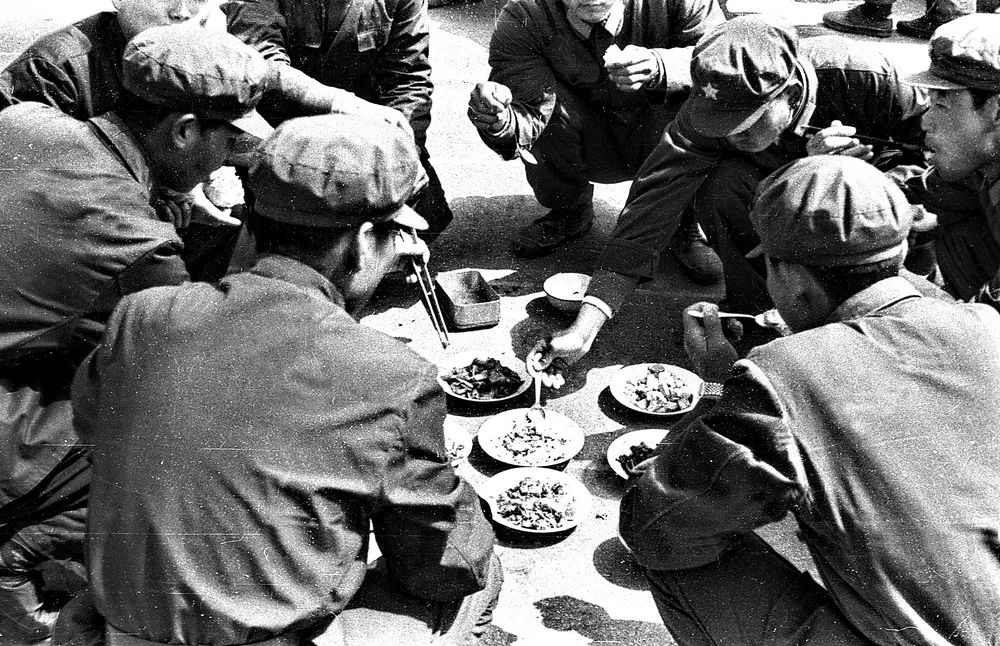 干部战士蹲在地上围成一圈就餐,伙食比在连队好,顿顿有肉,主食管够。就怕刮风,沙子尘土吹到饭菜里吃着牙碜。