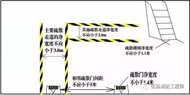 除本规范另有规定外,公共建筑内疏散门和安全出口的净宽度不应小于0.9米,疏散走道和疏散楼梯的净宽度不应小于1.1米。《建筑设计防火规范》(GB50016-2014)5.5.18