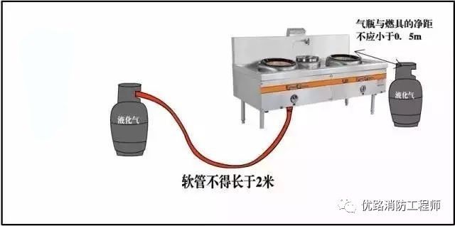 气瓶与燃具的净距不应小于0.5m。《城 镇 燃 气 设 计 规 范》(GB50028-2006)8.7.2