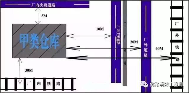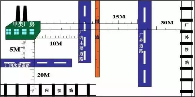 散发可燃气体、可燃蒸气的甲类厂房与厂外铁路中心线、厂内铁路中心线、厂外道路路边、厂内主要道路路边和厂内次要道路路边的防火间距不应小于30、20、15、10和5米。《建筑设计防火规范》(GB50016-2014)3.4.3