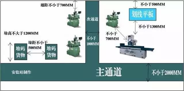 机床与划线或检验平板之间的最小距离应不小于 1300 mm 平板与墙壁间的距离应不小于500 mm。《金属切削加工安全要求》(JB 7741 1995)4.5.3